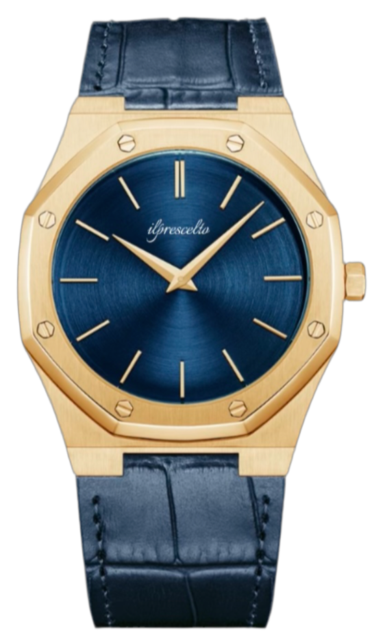 Introducing the Sunset Minimalist, a luxury timepiece that redefines elegance and precision. Encased in a radiant gold stainless steel frame, this watch exudes timeless sophistication. Its blue dial, adorned with gold-tone indices and hands, creates a striking contrast that commands attention while maintaining a refined aesthetic.